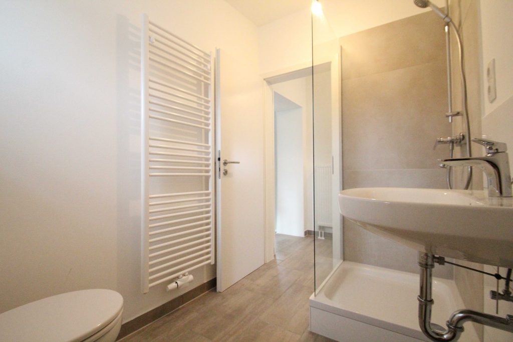 • Modernes Duschbad mit Glasabtrennung und Handtuchheizkörper